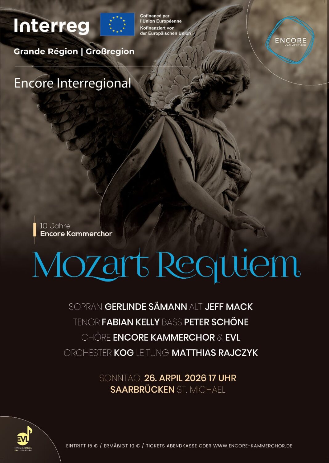 Der Kammerchor Encore wurde 2016 von Matthias Rajczyk in Riegelsberg gegründet und hat sich seitdem mit Konzerten im Saarland und im Trierer Raum ein festes Publikum erarbeitet. Zum zehnjährigen Jubiläum wagt der Chor einen größeren Schritt: Am Sonntag, 26. April 2026, erklingt in der Kirche St. Michael in Saarbrücken das Requiem von Wolfgang Amadeus Mozart – gemeinsam mit dem Ensemble Vocal du Luxembourg, dem Kammerorchester der Großregion und vier Gesangssolistinnen und -solisten aus der Region. Konzertbeginn ist um 17 Uhr.
